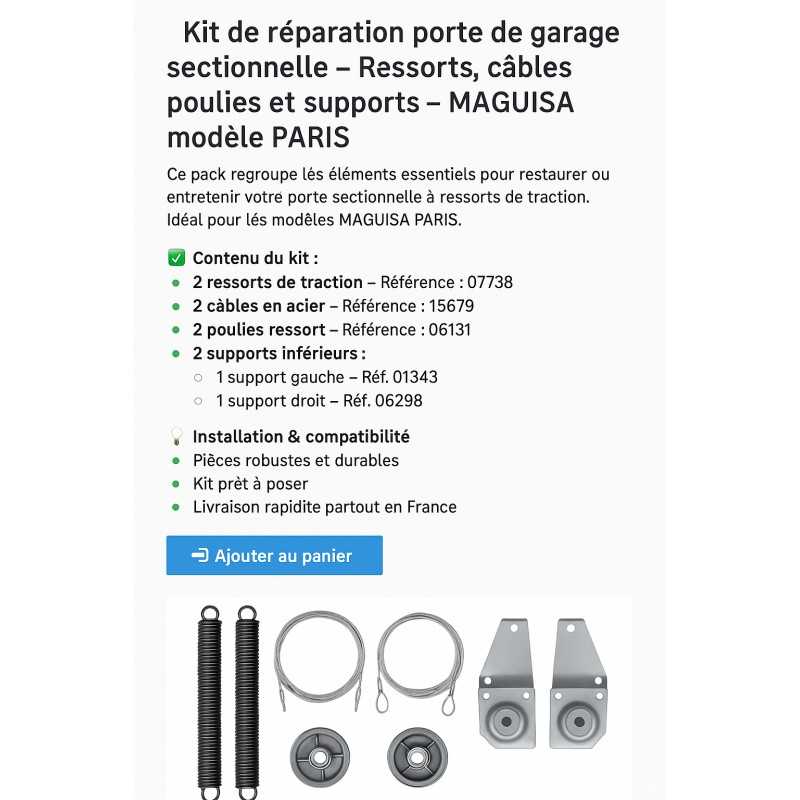 Kit de réparation pour porte de garage sectionnelle MAGUISA modèle PARIS comprenant 2 ressorts de traction (réf. 07738), 2 câbles acier (réf. 15679), 2 poulies ressort (réf. 06131) et 2 supports inférieurs (réf. 01343 gauche, 06298 droite). ✔ Kit prêt à poser, parfait pour remplacement ou entretien rapide. Livraison rapide en France 🇫🇷