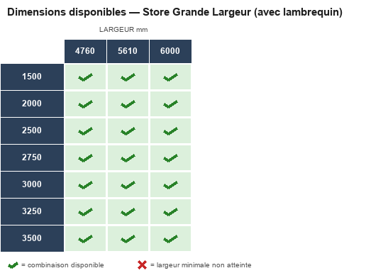 - Avec lambrequin : avancées 1 500 à 3 500 mm × largeurs 4 760 à 6 000 mm