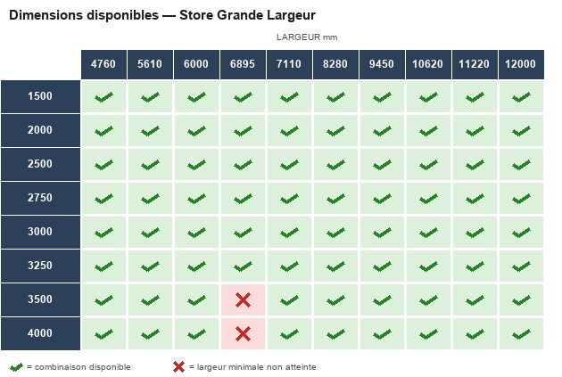 - Sans lambrequin : avancées 1 500 à 4 000 mm × largeurs 4 760 à 12 000 mm