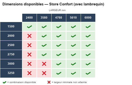 - Avec lambrequin : avancées 1 500 à 3 250 mm × largeurs 2 400 à 6 000 mm