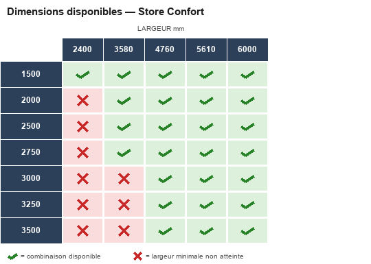 - ✅ Type de store : Coffre integral Confort - largeur jusqu'a 6 000 mm, avancee jusqu'a 3 500 mm