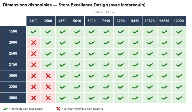 • Avec lambrequin : avancées 1 500 à 3 500 mm × largeurs 2 400 à 6 000 mm
