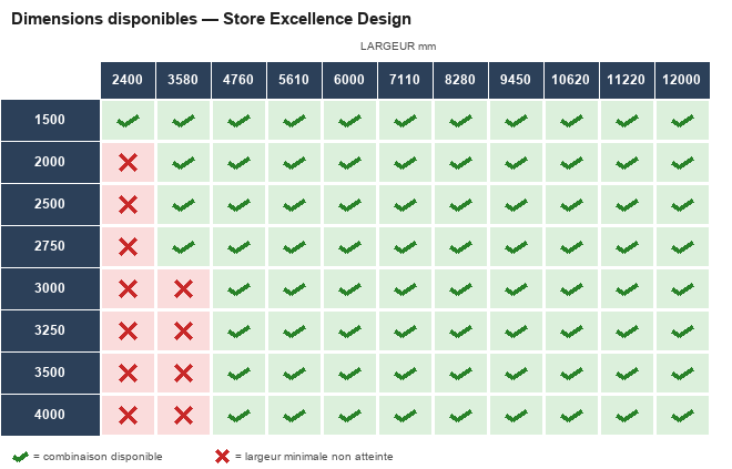 • Sans lambrequin : avancées 1 500 à 4 000 mm × largeurs 2 400 à 12 000 mm