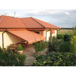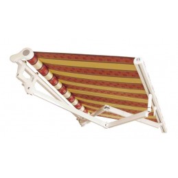 Store banne extérieur sans coffre. Largeur possible jusque 12 m, déploiement possible jusque 4,85 m. Fixation mural ou plafond ou sous toiture. Manœuvre manuelle ou électrique. Produit sur mesure garantie 7 ans. Livraison chez vous entre 4 et 6 semaines.