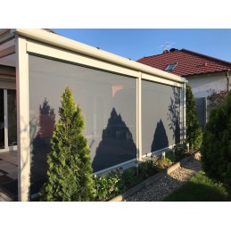 Store banne extérieur sans coffre. Largeur possible jusque 12 m, déploiement possible jusque 4,85 m. Fixation mural ou plafond ou sous toiture. Manœuvre manuelle ou électrique. Produit sur mesure garantie 7 ans. Livraison chez vous entre 4 et 6 semaines.