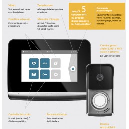 Ecran tactile 7” Interface personnalisable Vision nocturne Affichage de la température extérieure Communication possible entre 2 moniteurs Ouverture / fermeture portail et portillon Pilotage de 5 équipements io-homecontrol® Vision grand angle 102° Historique photos des visiteurs manqués
