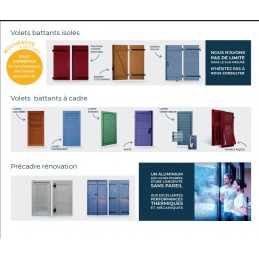 Volets Battants PERSIENNES en Aluminium : Cadre 33,5/68 mm, lames ajourées, non ajourées, orientables. Finition mat, brillant ou structuré. Ferrage noir ou blanc. Quincaillerie aluminium. Durable et élégant. Personnalisation possible.